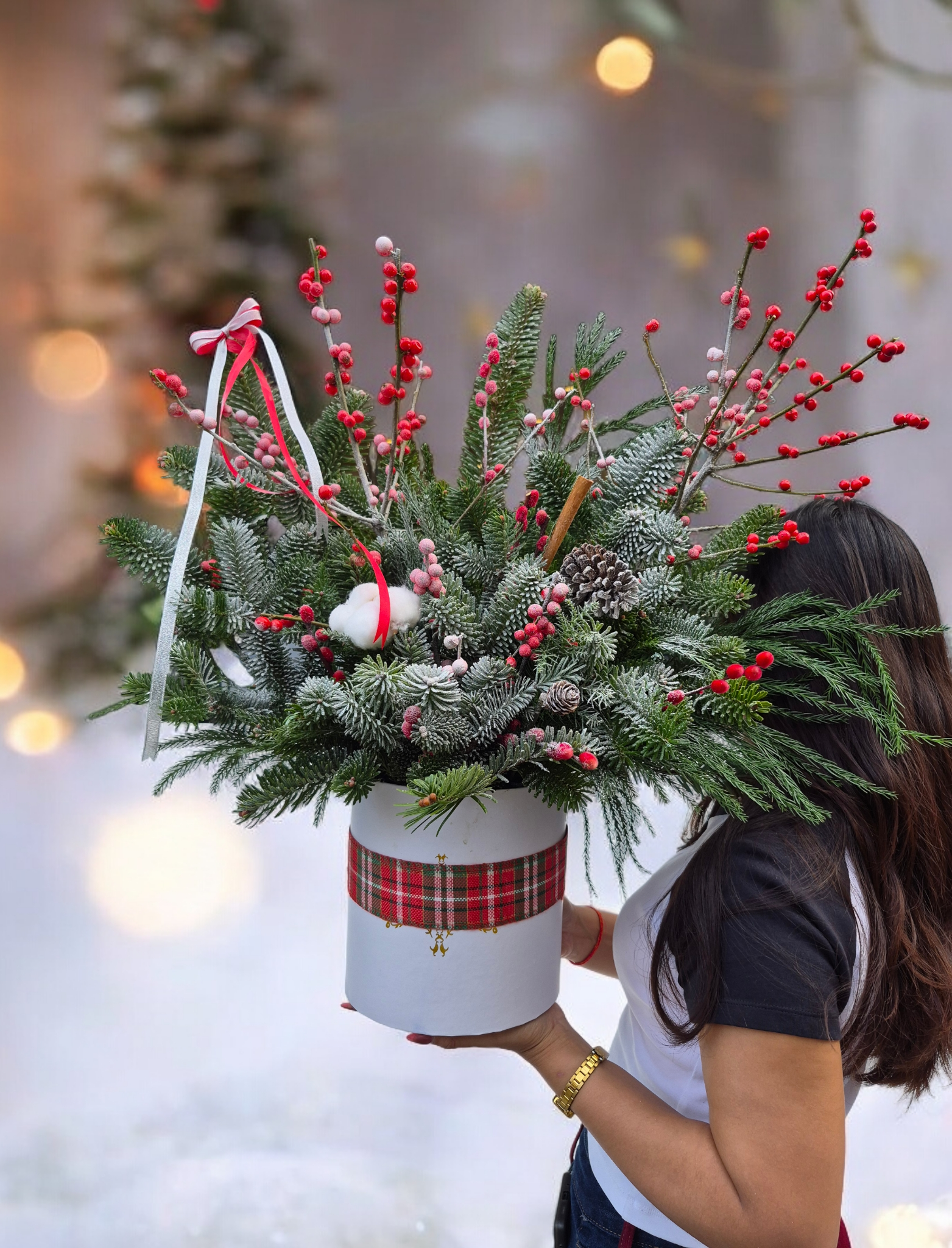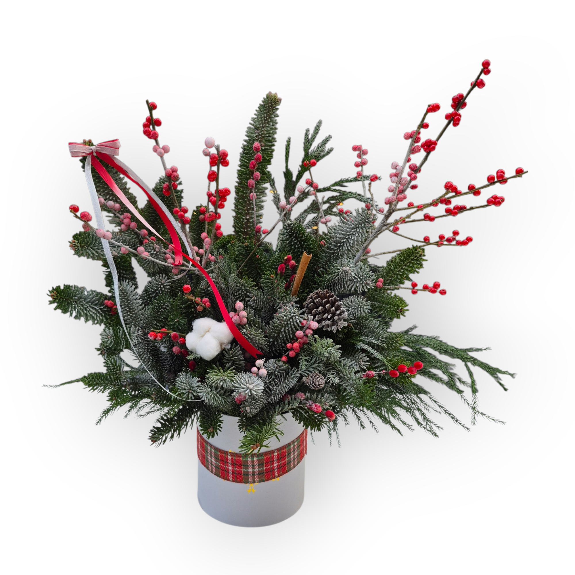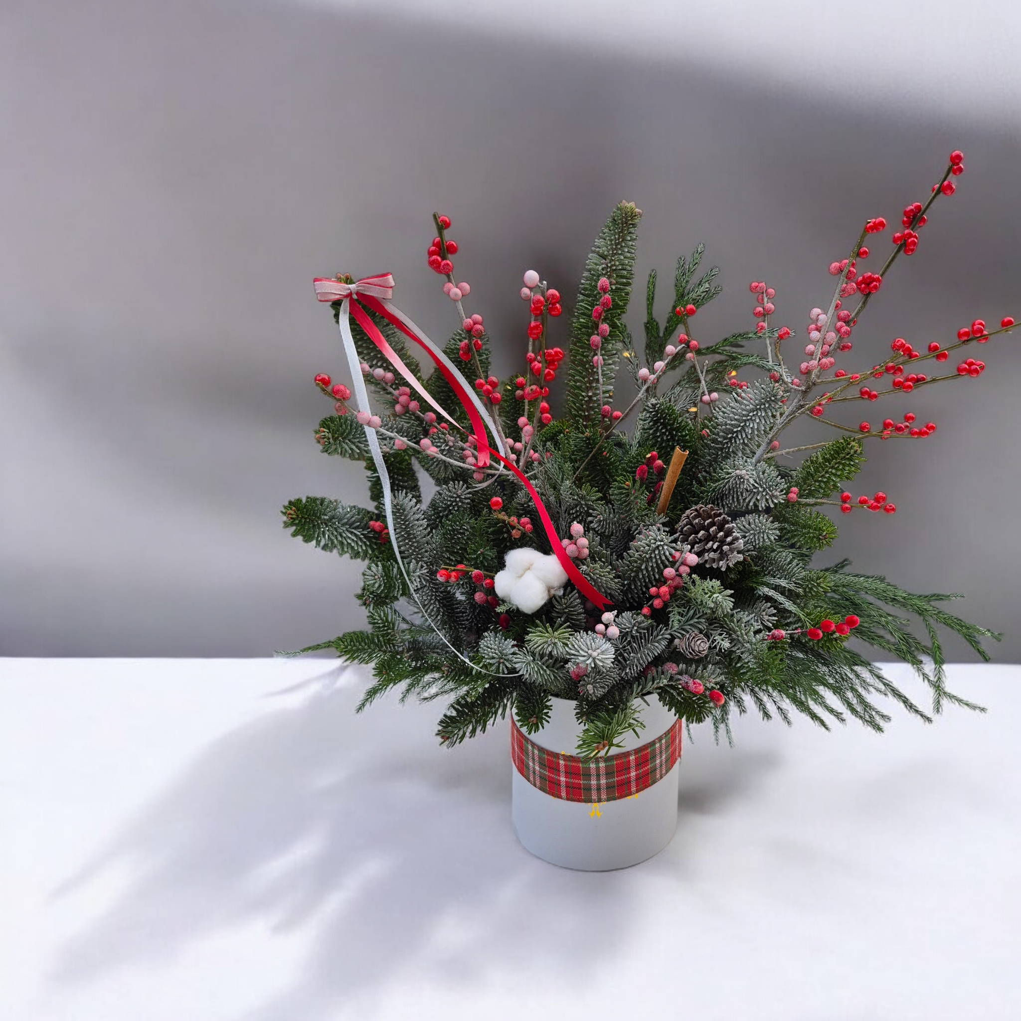 A warm and joyful Christmas bucket designed to brighten the festive season. Featuring winter greenery, this arrangement brings a perfect balance of holiday warmth and natural beauty.