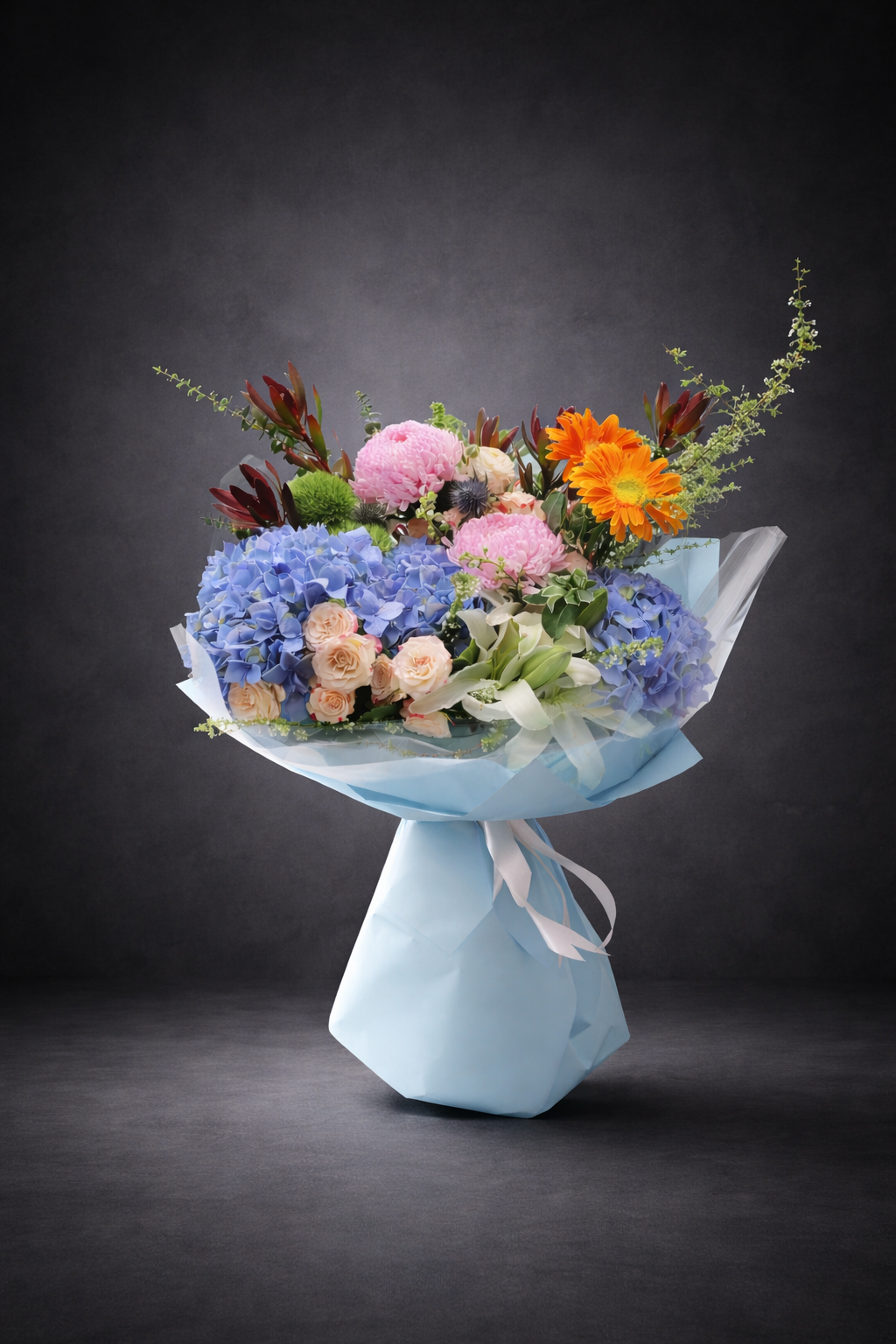 A grand arrangement of hydrangeas, roses, and premium blooms. Designed to impress with a rich palette of luxury colors.