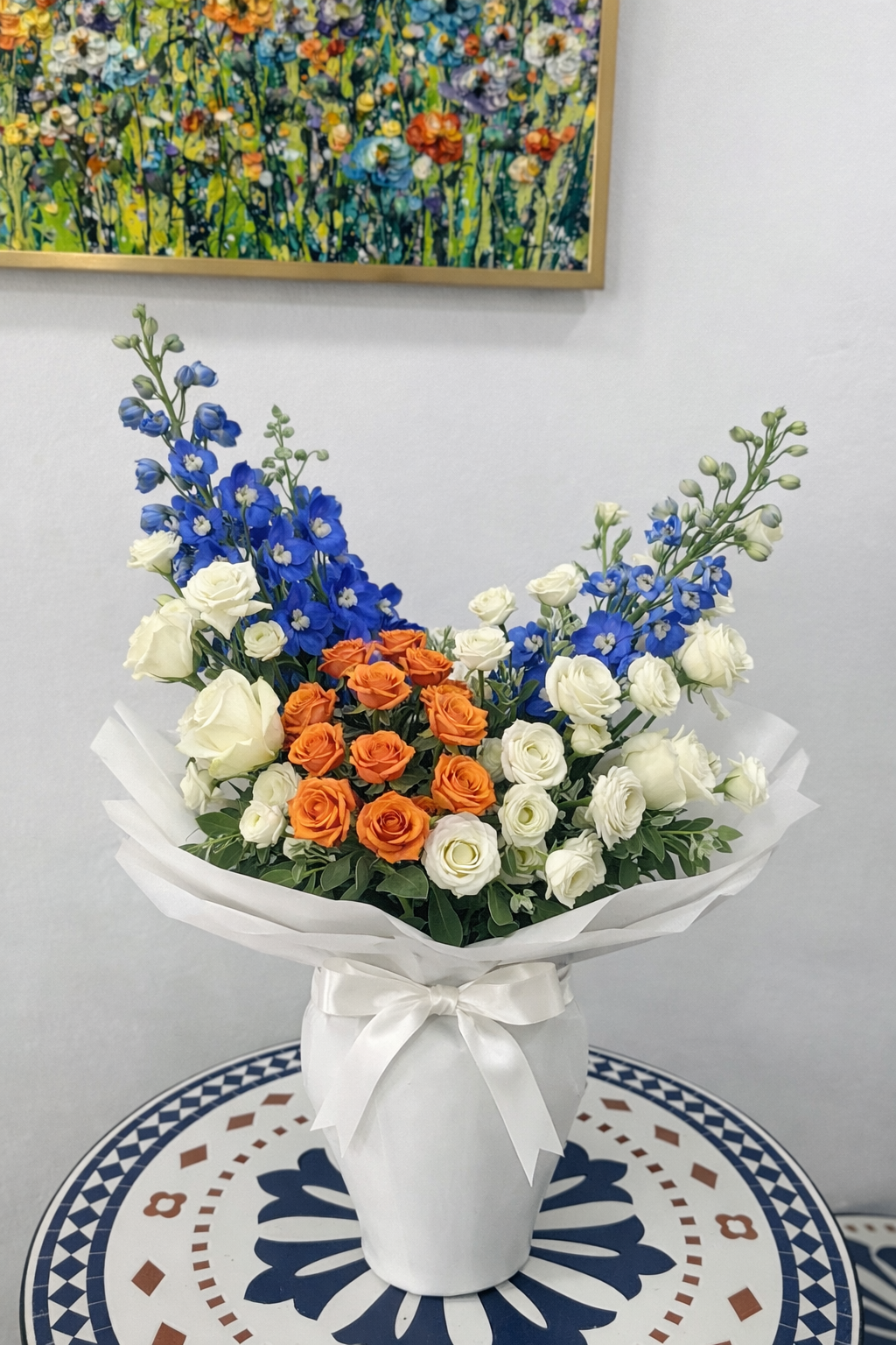 An elegant floral arrangement designed with graceful movement and balance. Featuring a refined mix of deep blue delphiniums, soft white roses, delicate ranunculus, and warm orange spray roses, this piece flows naturally in a gentle S-curve. Arranged in a white-wrapped glass vase and finished with a classic ribbon, it brings a modern yet artistic touch to any space.