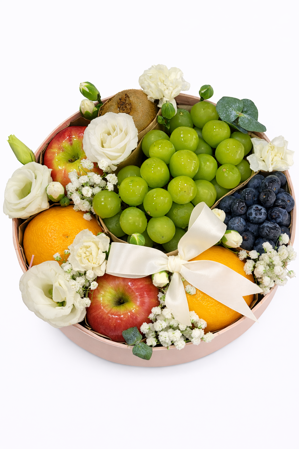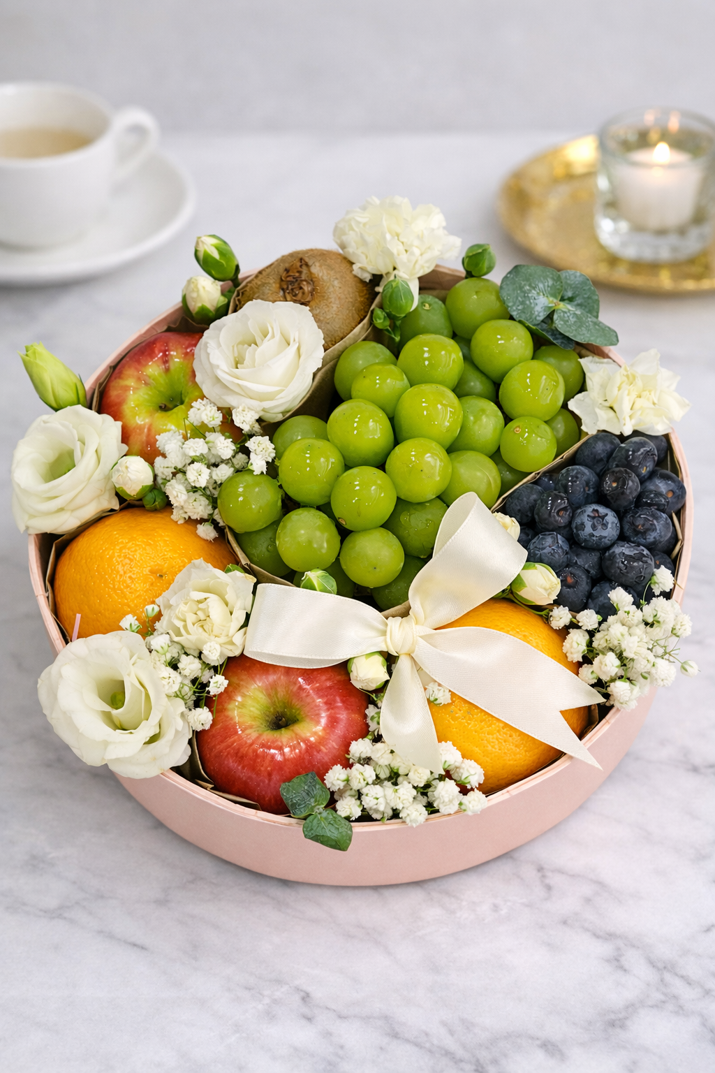 A beautifully curated round fruit box featuring premium green grapes, crisp apples, juicy oranges, blueberries, and kiwi, delicately paired with soft white blooms and greenery. Finished with a classic ivory ribbon, this elegant arrangement blends freshness and floral charm, making it a thoughtful and uplifting gift for any occasion.