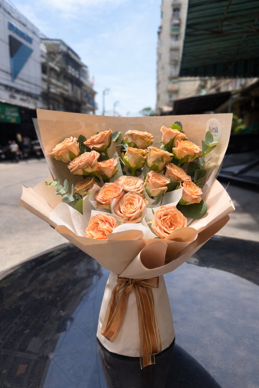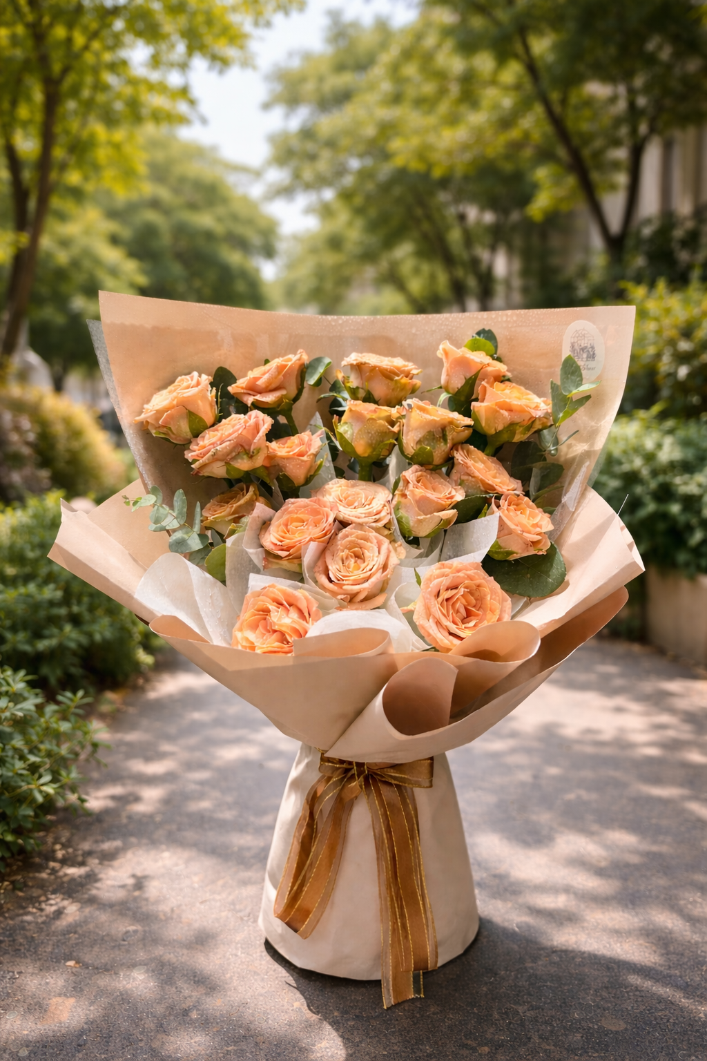 Elegant cappuccino rose blooms paired with fresh greenery, designed to express warmth, affection, and quiet sophistication.