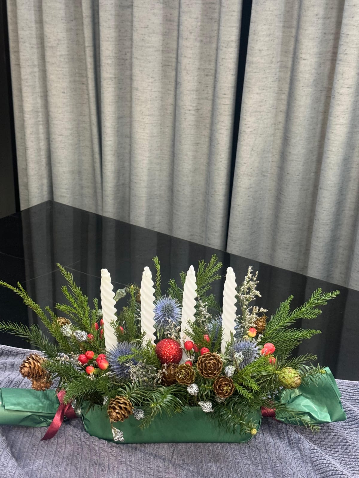 Brighten your holiday table with this elegant arrangement of fresh evergreens, red berries, pinecones, and four glowing white candles. Perfect for any festive gathering.
