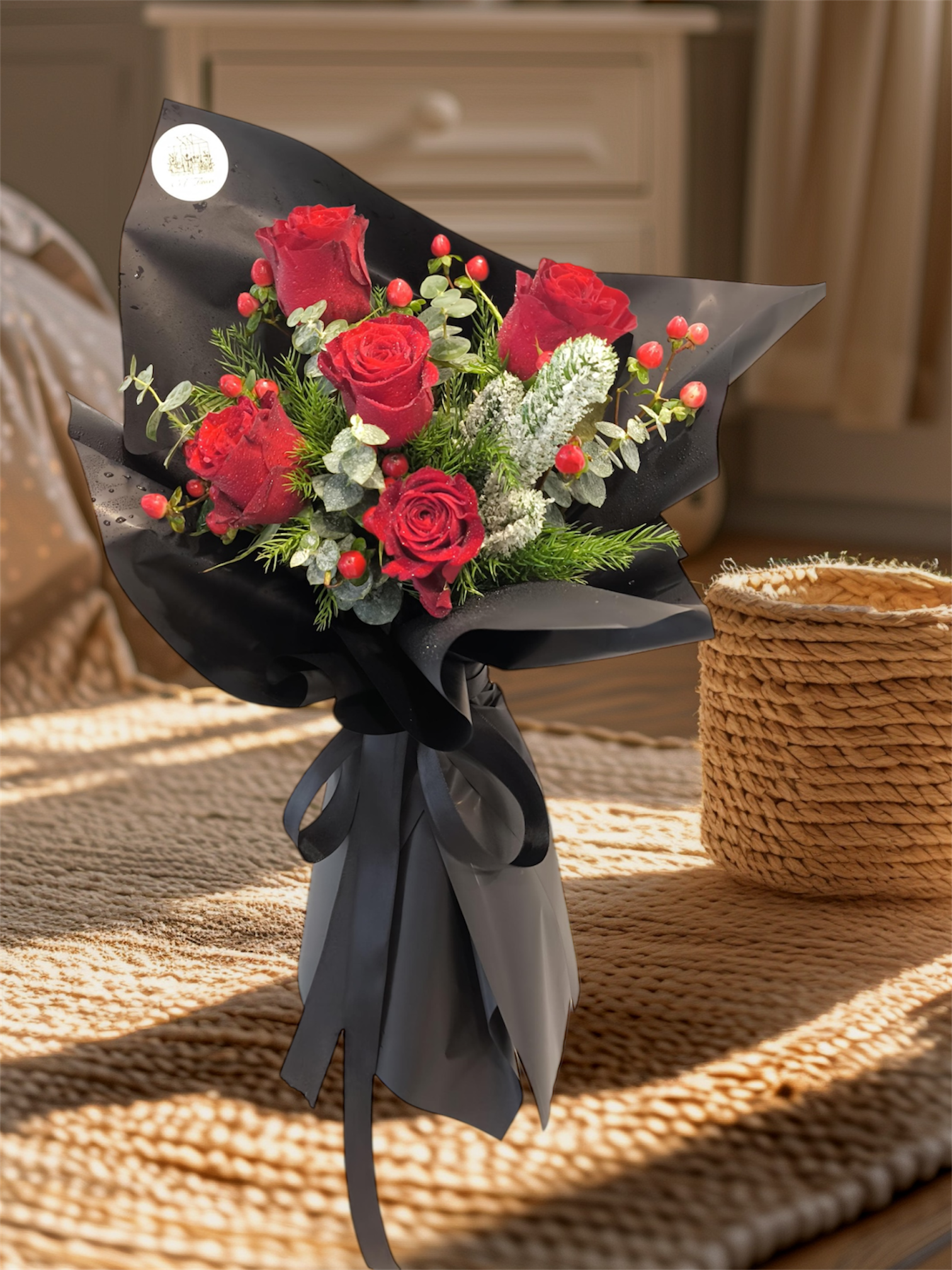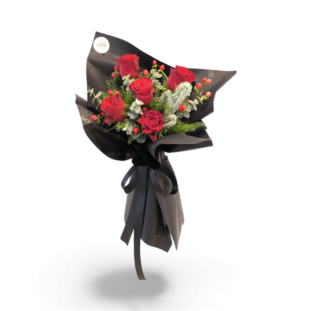 A beautiful Christmas bouquet with red roses, berries, and winter greens, wrapped in elegant black paper. Festive, modern, and perfect for gifting.