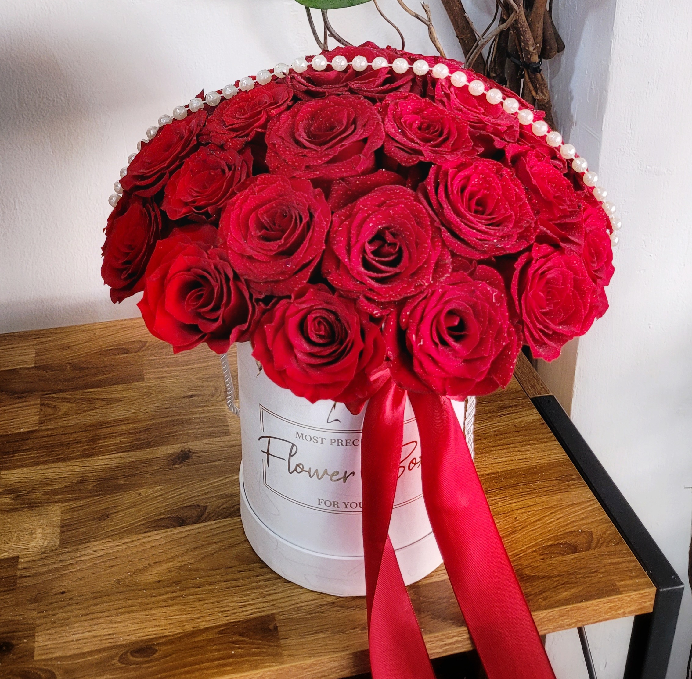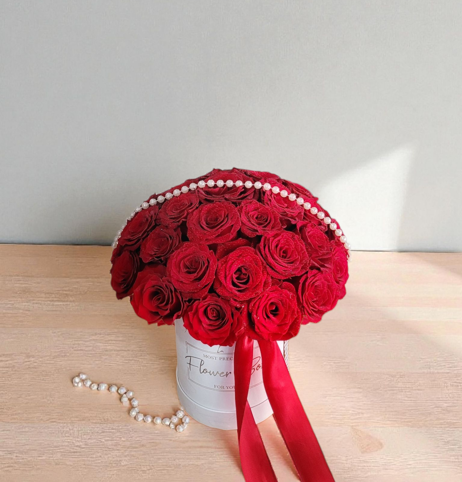 An unforgettable expression of love and passion — our Eternal Ruby Rose Bouquet features 35 stunning red roses, artfully arranged in a perfect dome and accented with elegant pearl detailing.