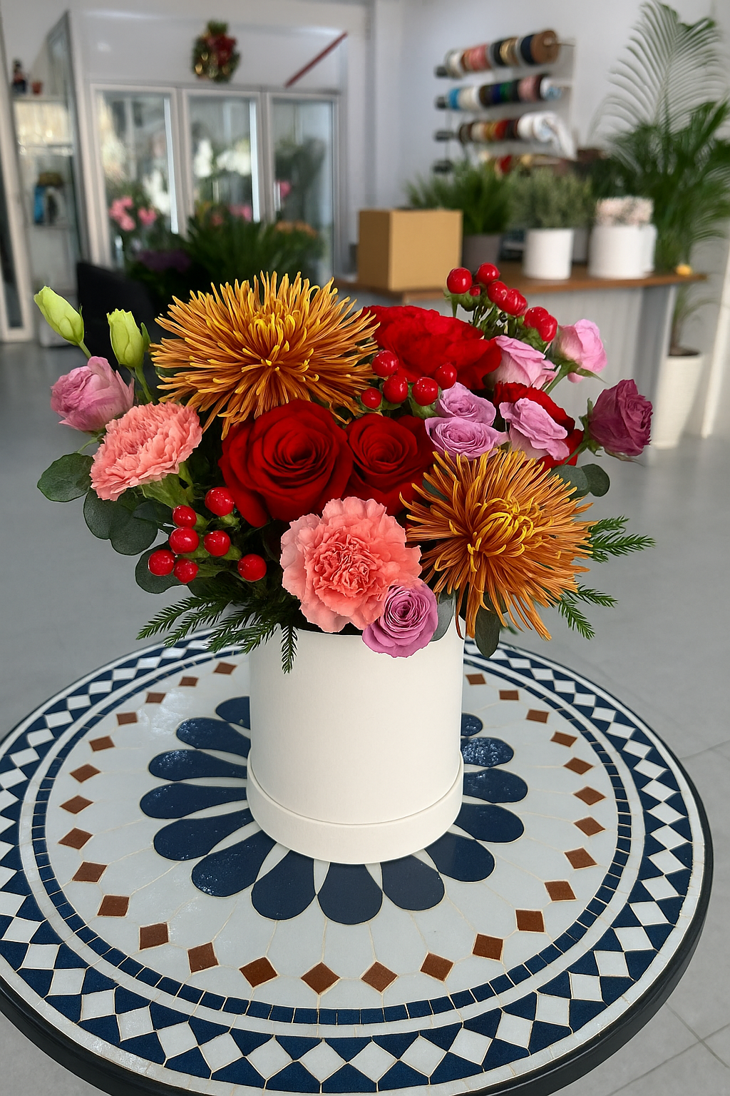 A vibrant and stylish mix arranged in a modern white bucket. This bouquet features golden spider chrysanthemums, premium red roses, soft pink carnations, lavender lisianthus, and fresh hypericum berries. The warm gold tones blend beautifully with romantic reds and pastel shades, creating a rich, festive, and elegant look. Perfect for birthdays, celebrations, or as a charming gift that brightens any space.