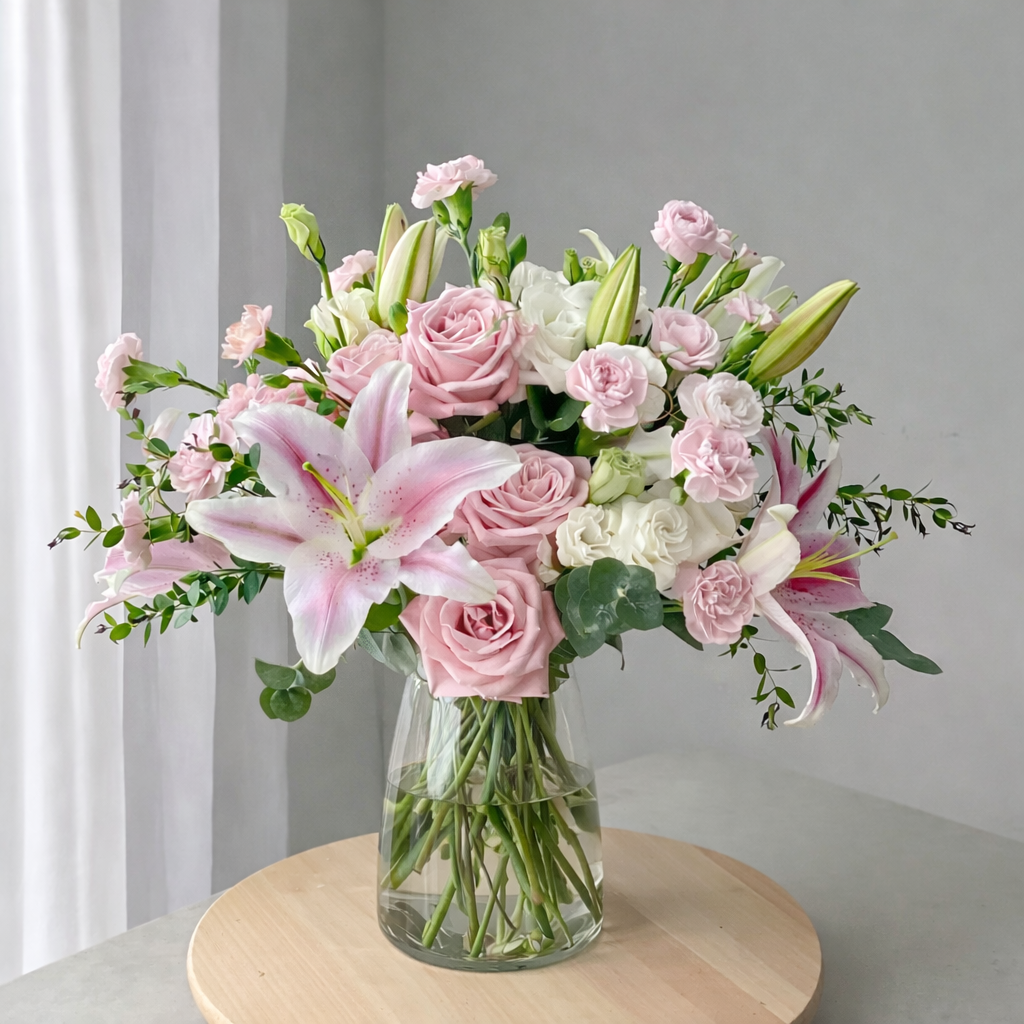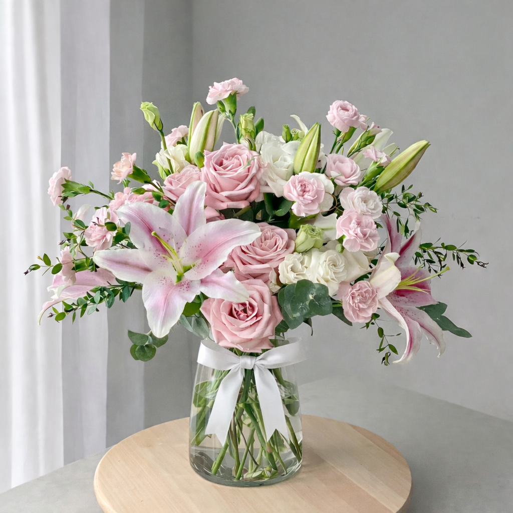 An enchanting mix of blooming pink lilies and roses, thoughtfully arranged to highlight softness and natural beauty. Finished with a delicate ribbon, this vase arrangement feels effortlessly elegant.