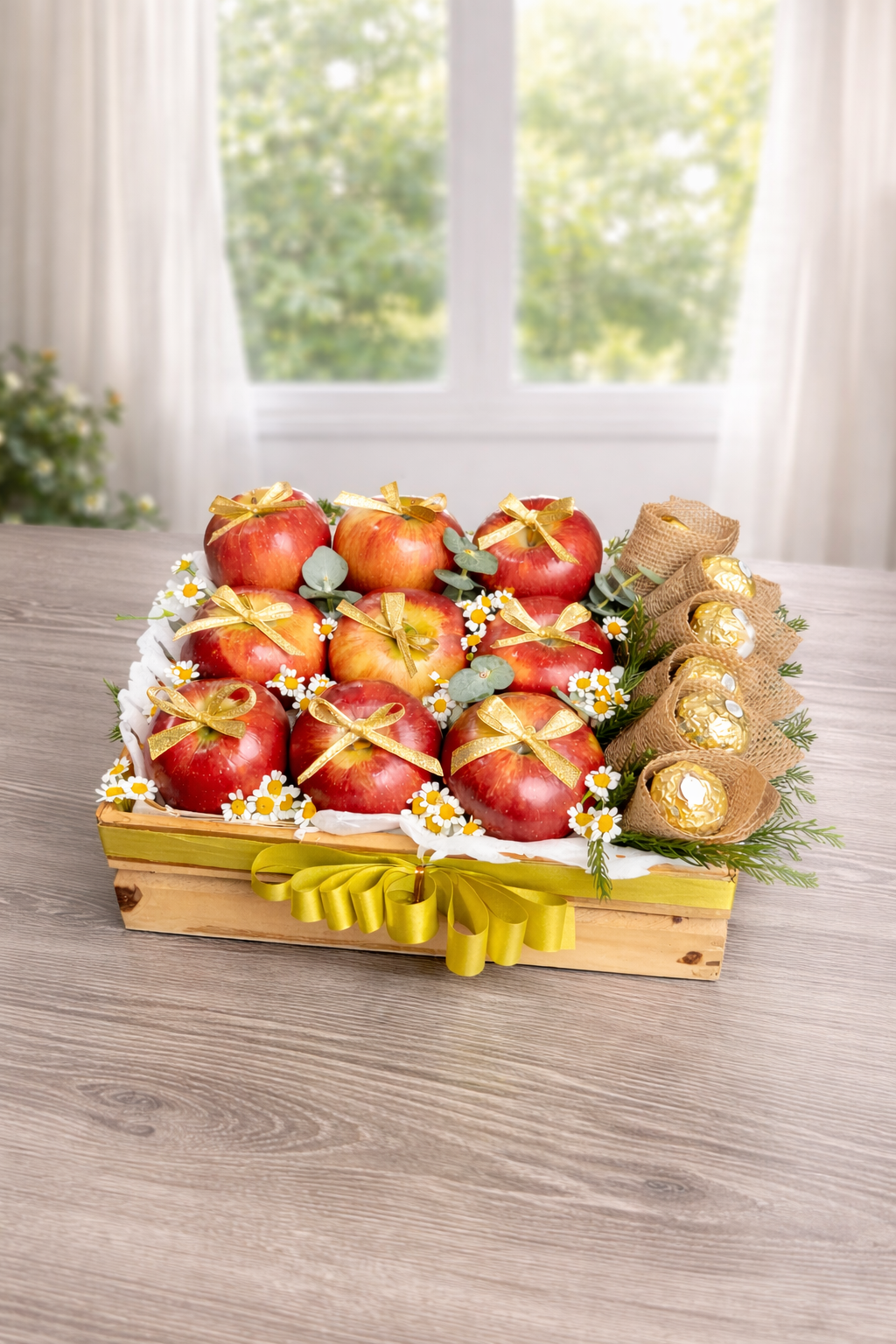 luxurious fruit gift tray featuring premium red apples adorned with golden ribbons, complemented by Ferrero Rocher chocolates for an extra touch of indulgence. Finished with soft florals and greenery, this elegant arrangement symbolizes prosperity, appreciation, and refined gifting.