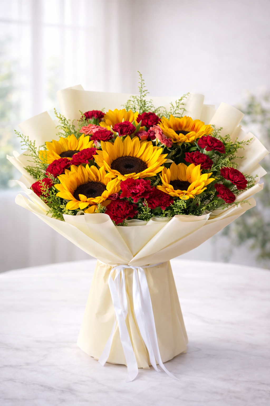 A joyful arrangement of radiant sunflowers paired with rich red blooms and fresh greenery, wrapped in soft ivory tones. Designed to express warmth, happiness, and heartfelt celebration.