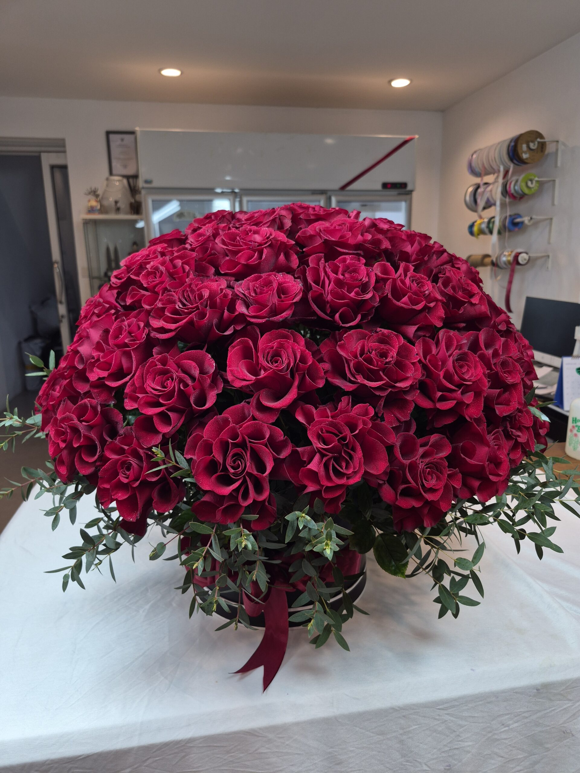 An elegant and luxurious arrangement featuring 101 premium red roses, beautifully styled in a classic bucket. Each rose is expertly reflexed to create a rich, full dome shape, highlighting the depth and intensity of its crimson color. Accented with fresh greenery and finished with a refined ribbon, this bouquet makes a powerful statement of love, passion, and devotion.