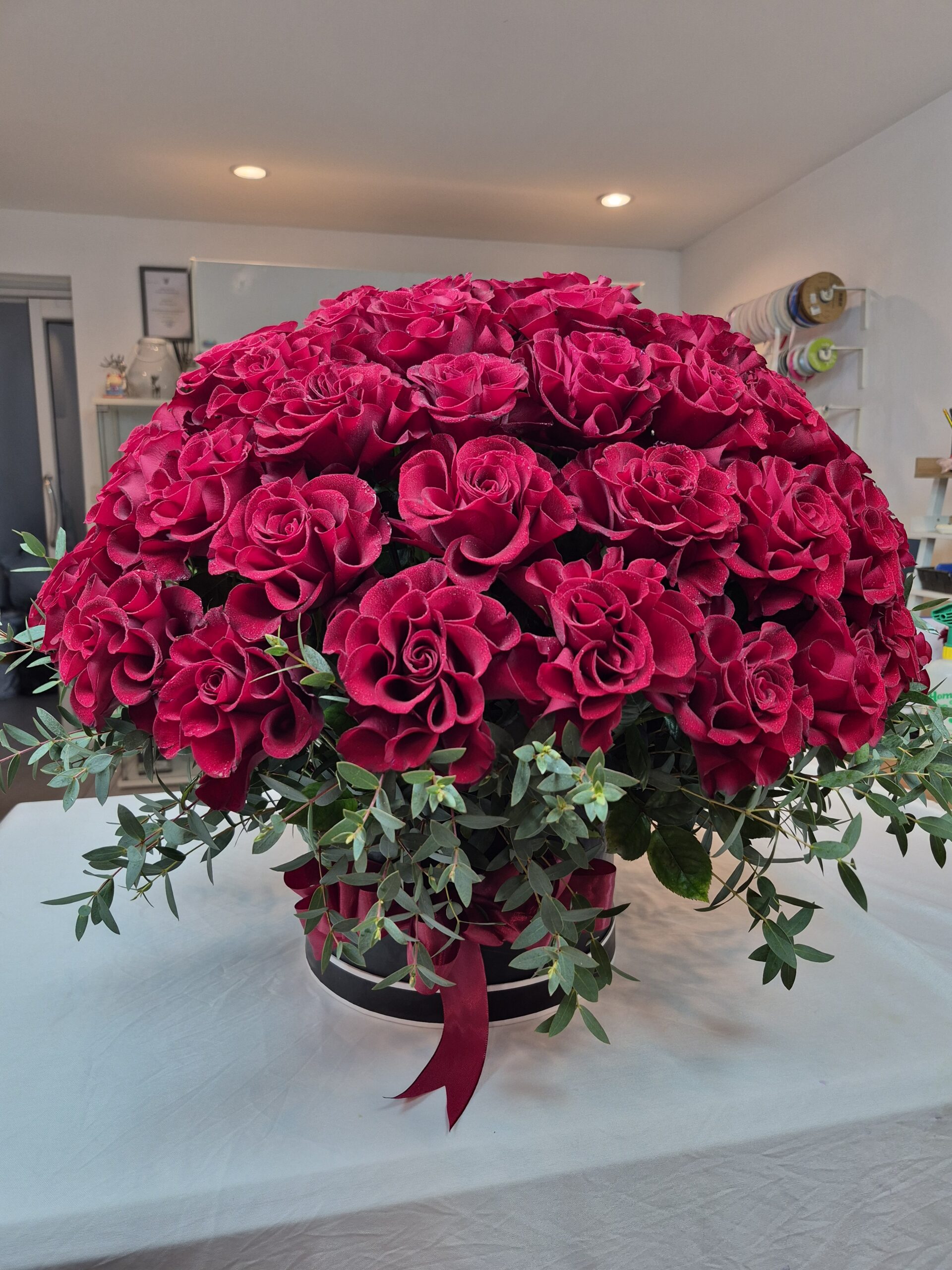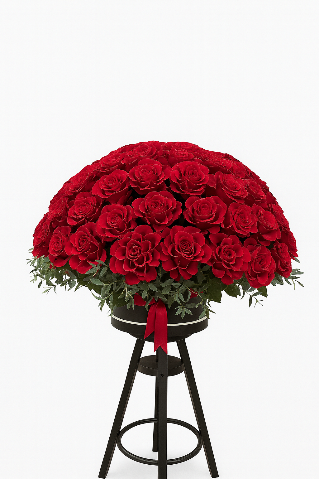 An opulent arrangement of 101 premium red reflex roses, artistically styled in a classic bucket for a bold and unforgettable statement. Each rose is carefully reflexed to create a full, luxurious dome shape, symbolizing deep love, passion, and devotion. Finished with elegant greenery and a refined ribbon, this arrangement is designed to impress from every angle.