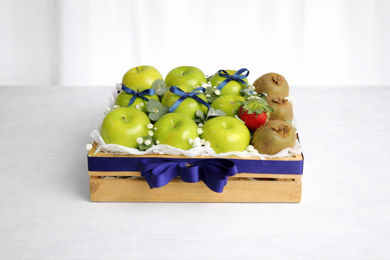 A fresh and elegant fruit arrangement featuring crisp green apples beautifully paired with sweet kiwi and a touch of strawberry, accented with delicate white florals and eucalyptus. Presented in a natural wooden crate and finished with a deep blue ribbon, this gift symbolizes health, care, and refined taste.