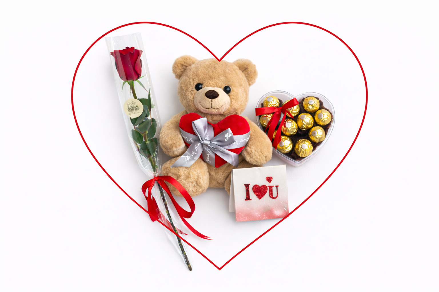 This adorable Hug Day combo brings together a soft teddy bear, a fresh red rose, indulgent chocolates, and a sweet message card — all arranged inside a heart outline to express comfort, care, and closeness.