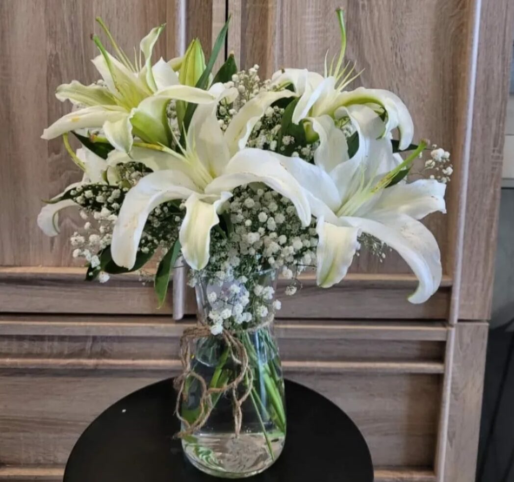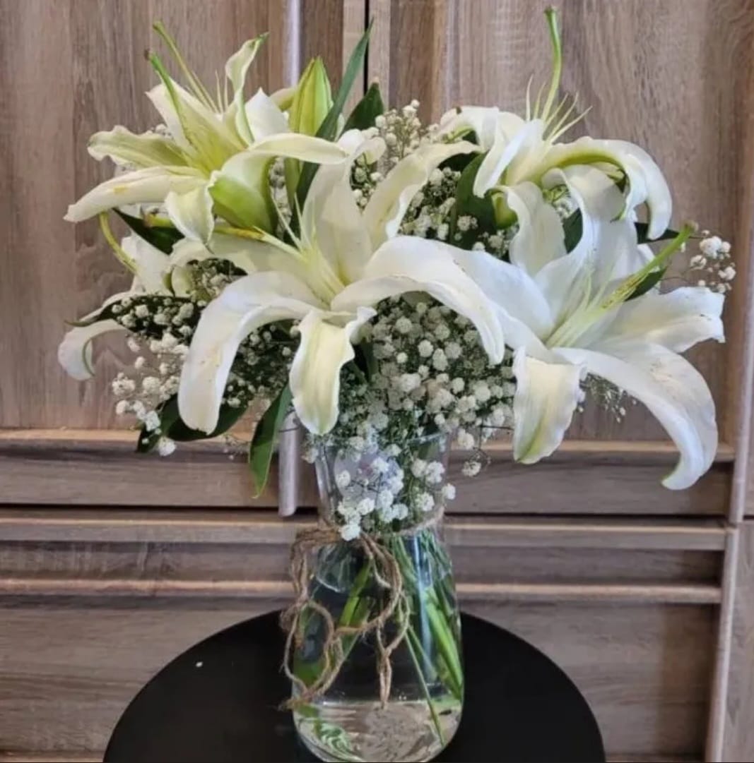 A simple and elegant vase of white lilies paired with delicate baby’s breath—perfect for any occasion. 🤍🌿