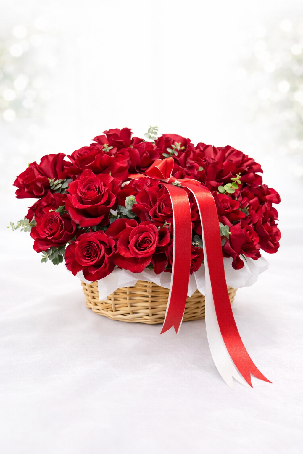 Beautifully arranged 21 Highland red roses in a classic basket, expressing bold love and heartfelt emotions.