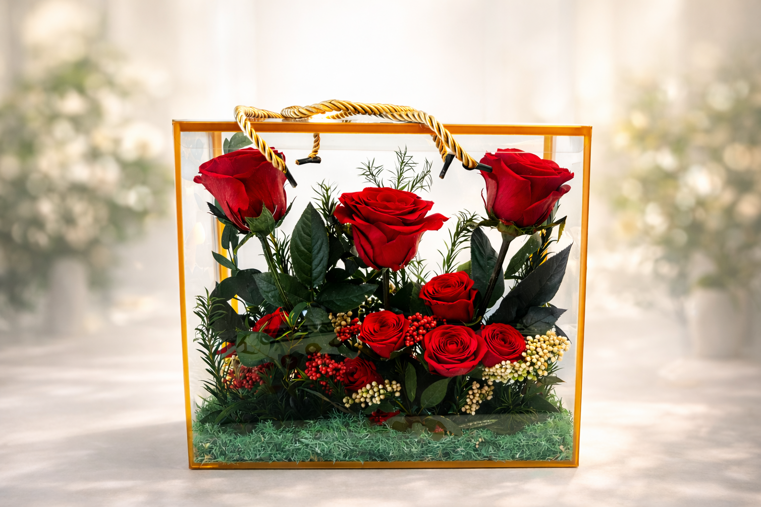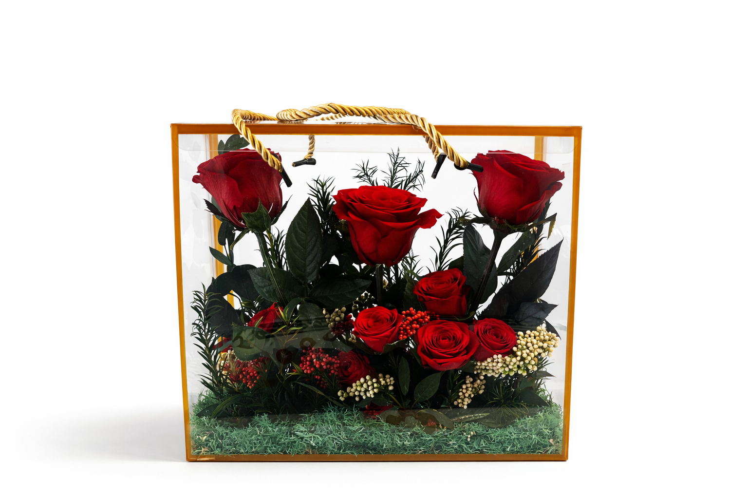 Bold red preserved roses rest gracefully inside a sleek transparent plastic box, creating a striking balance of passion and sophistication.