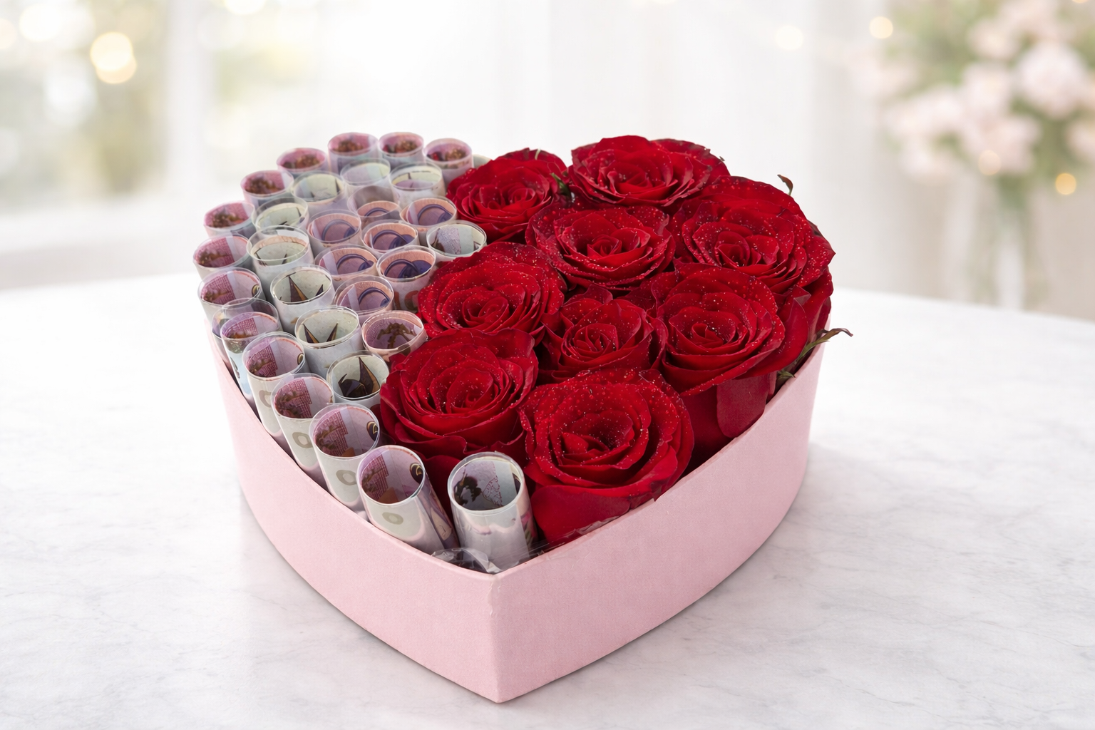 A romantic heart-shaped arrangement of velvety red roses paired with elegantly rolled currency, symbolizing love, prosperity, and thoughtful gifting.