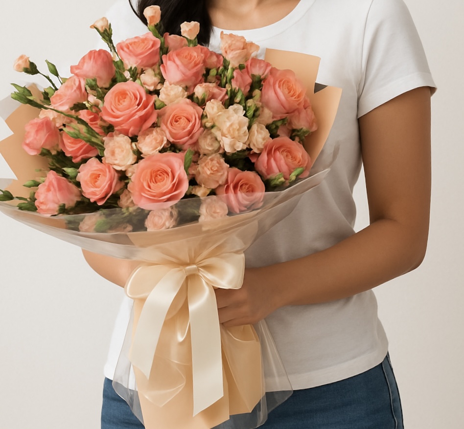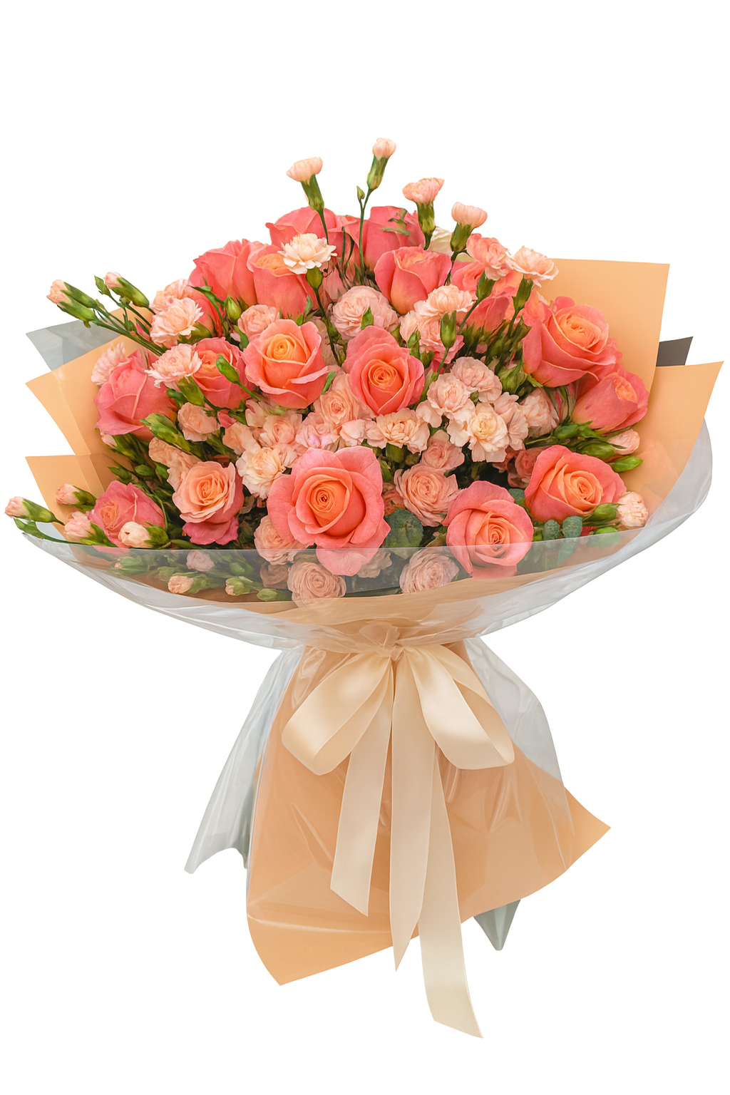 A romantic garden-inspired bouquet made with fresh peach roses and soft carnation sprays, arranged in a lush and airy style. The gentle colors bring a soft, natural charm to the design.