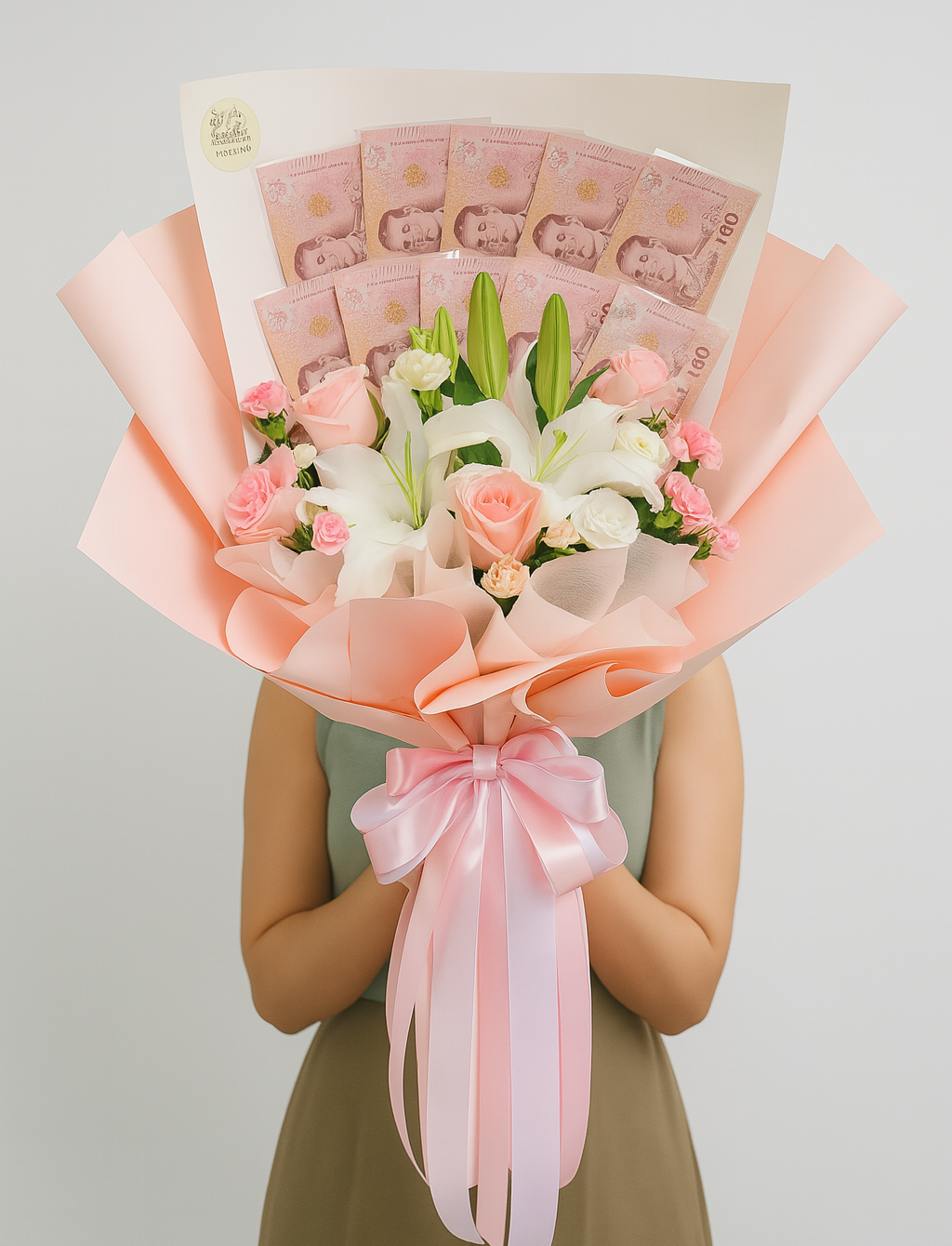 A sweet mix of beauty and blessings — this bouquet features fifteen 100-baht Thai notes paired with fresh white lilies, pink roses, spray roses, and mini carnations.