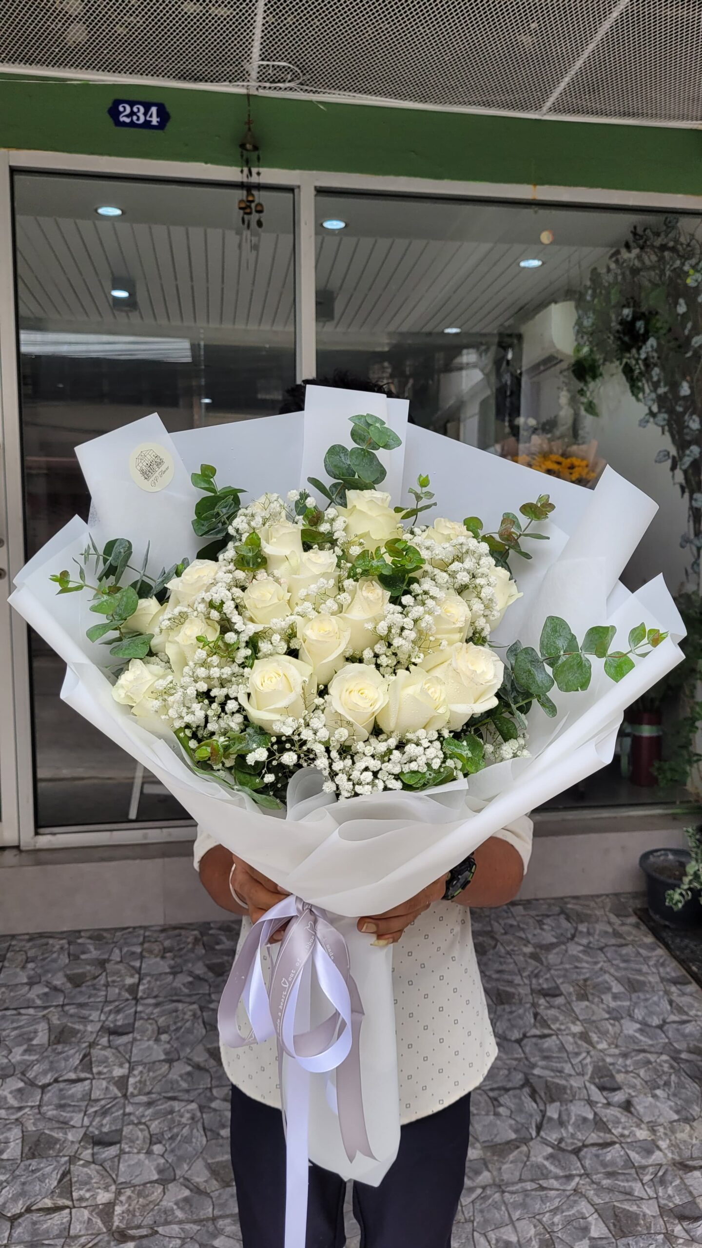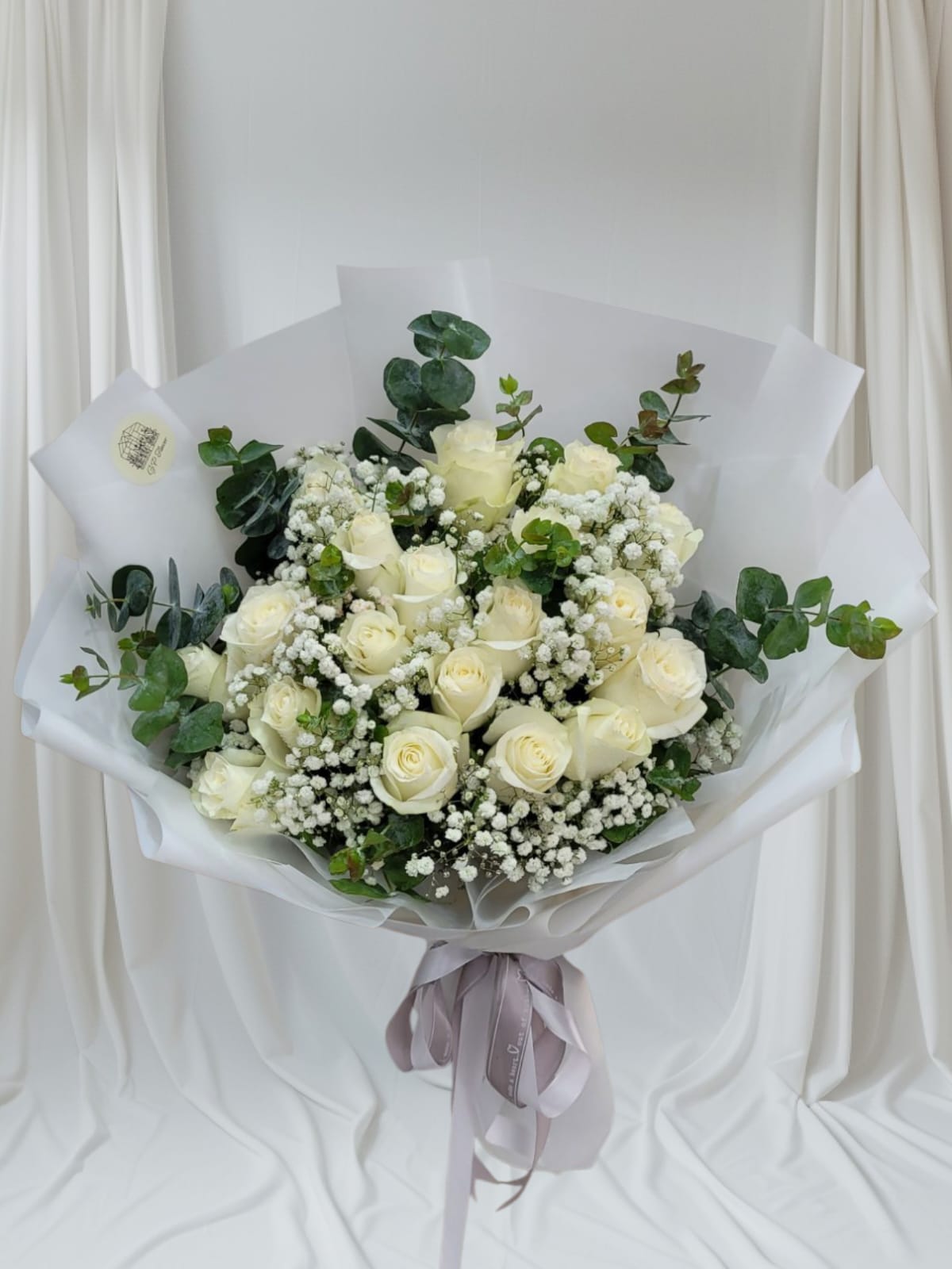 Pure white roses with baby’s breath and eucalyptus, wrapped in elegance. A bouquet that speaks peace, love, and timeless charm.