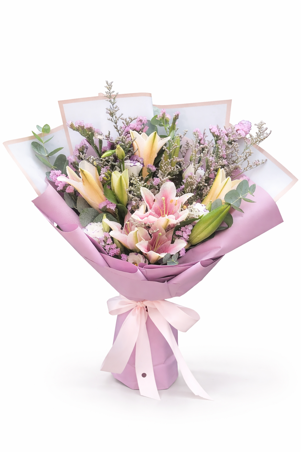 A graceful bouquet of fresh lilies highlighted with soft purple accents and delicate fillers, wrapped in gentle pastel tones. Designed to express calm elegance and natural charm.