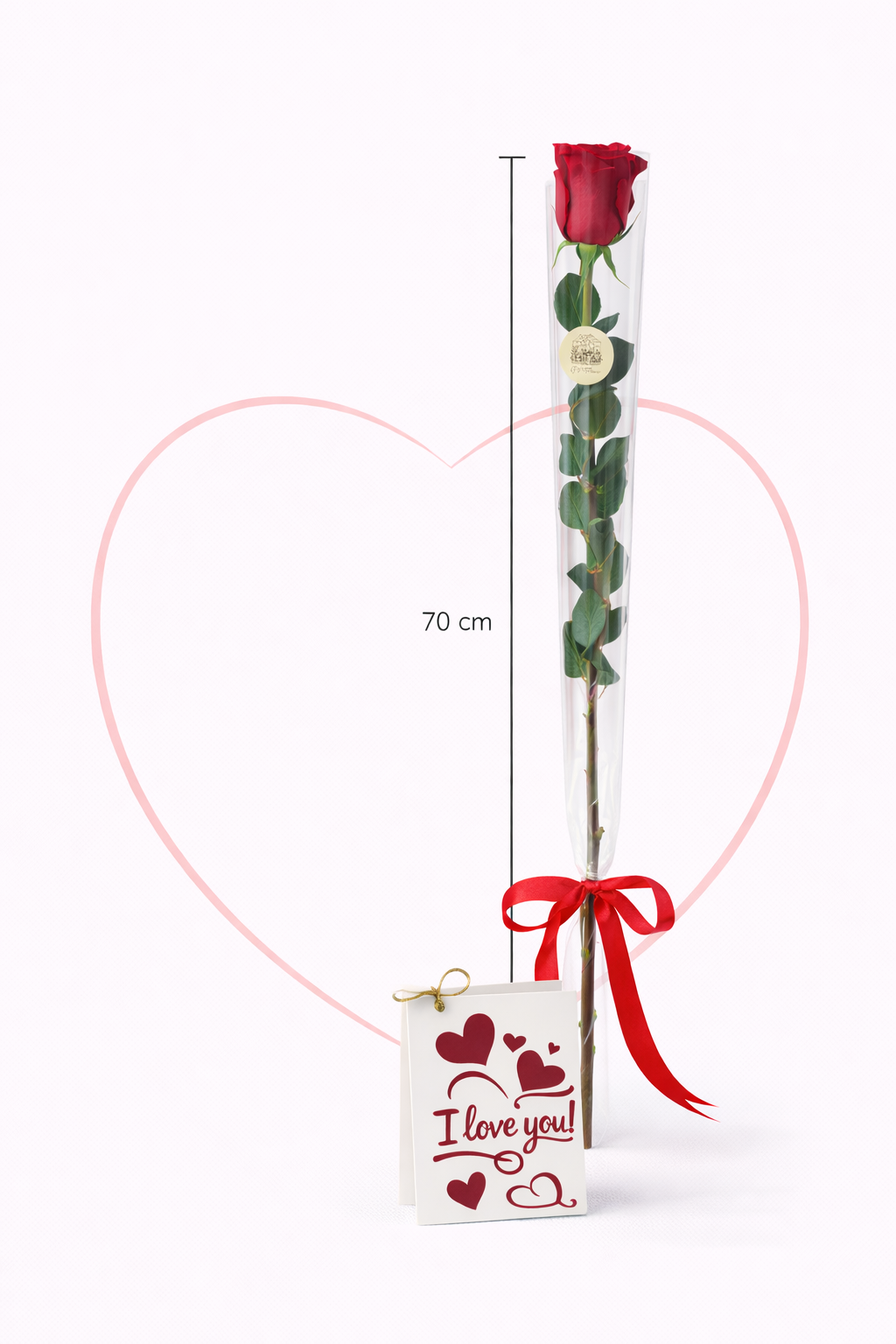 A timeless symbol of love. This elegant 70 cm long-stem red rose is beautifully wrapped and finished with a romantic ribbon — perfect for Rose Day.