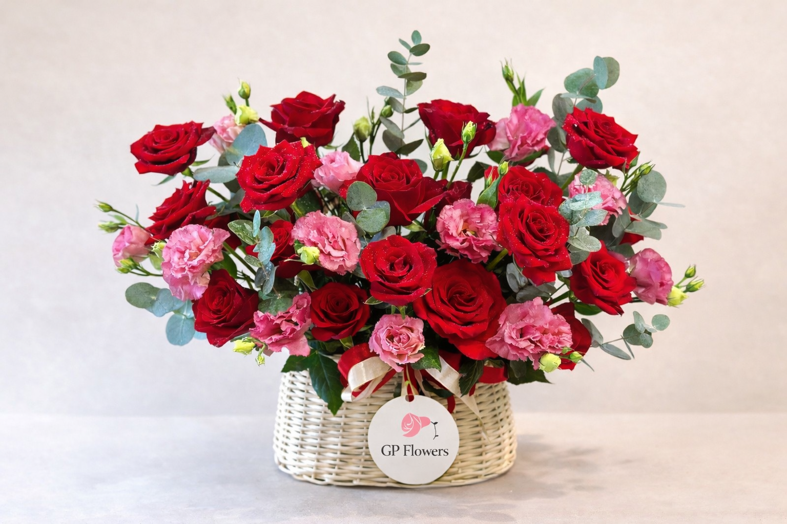 This elegant arrangement combines rich crimson roses with delicate pink lisianthus and fresh green eucalyptus foliage, creating a timeless expression of love and warmth in the basket.