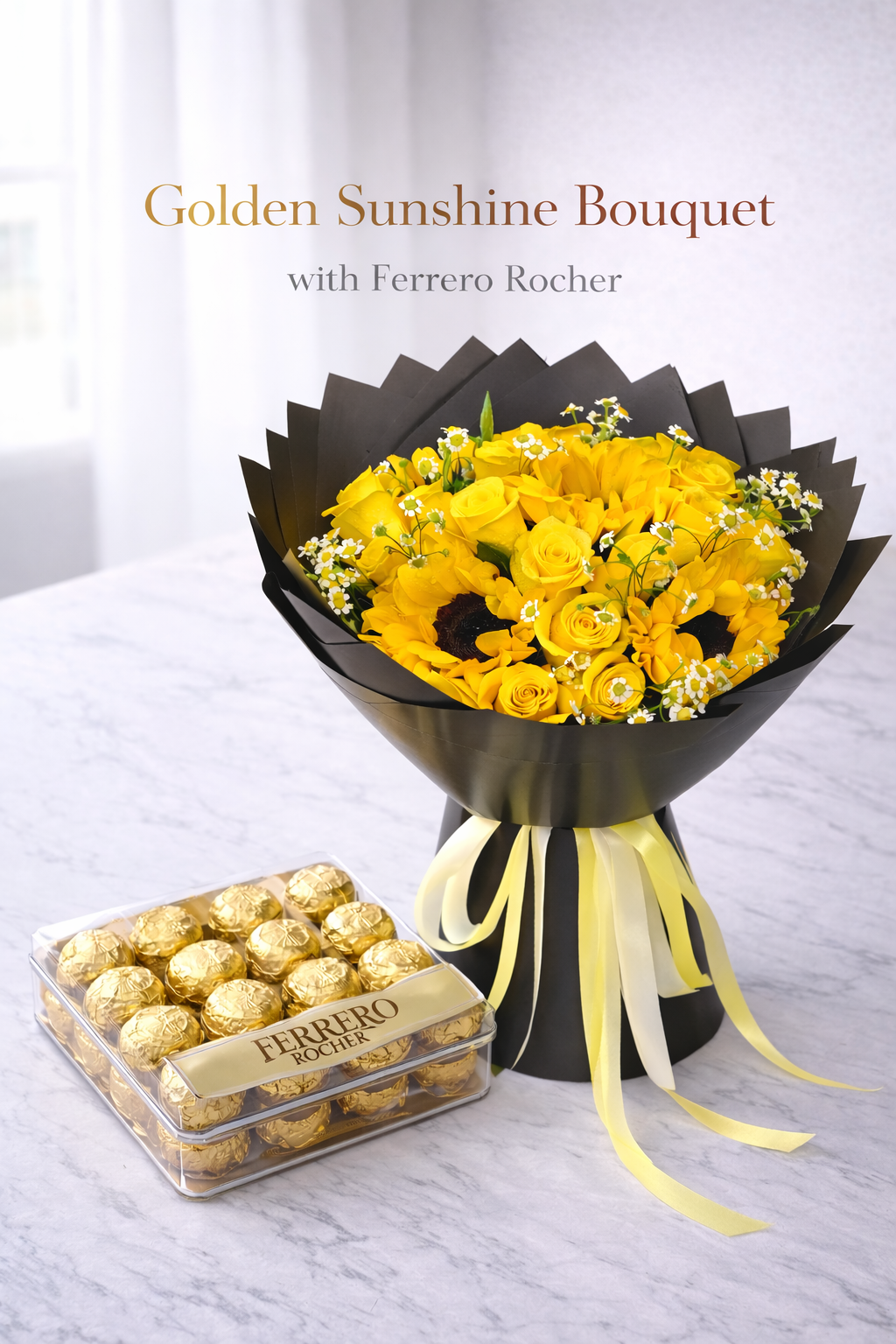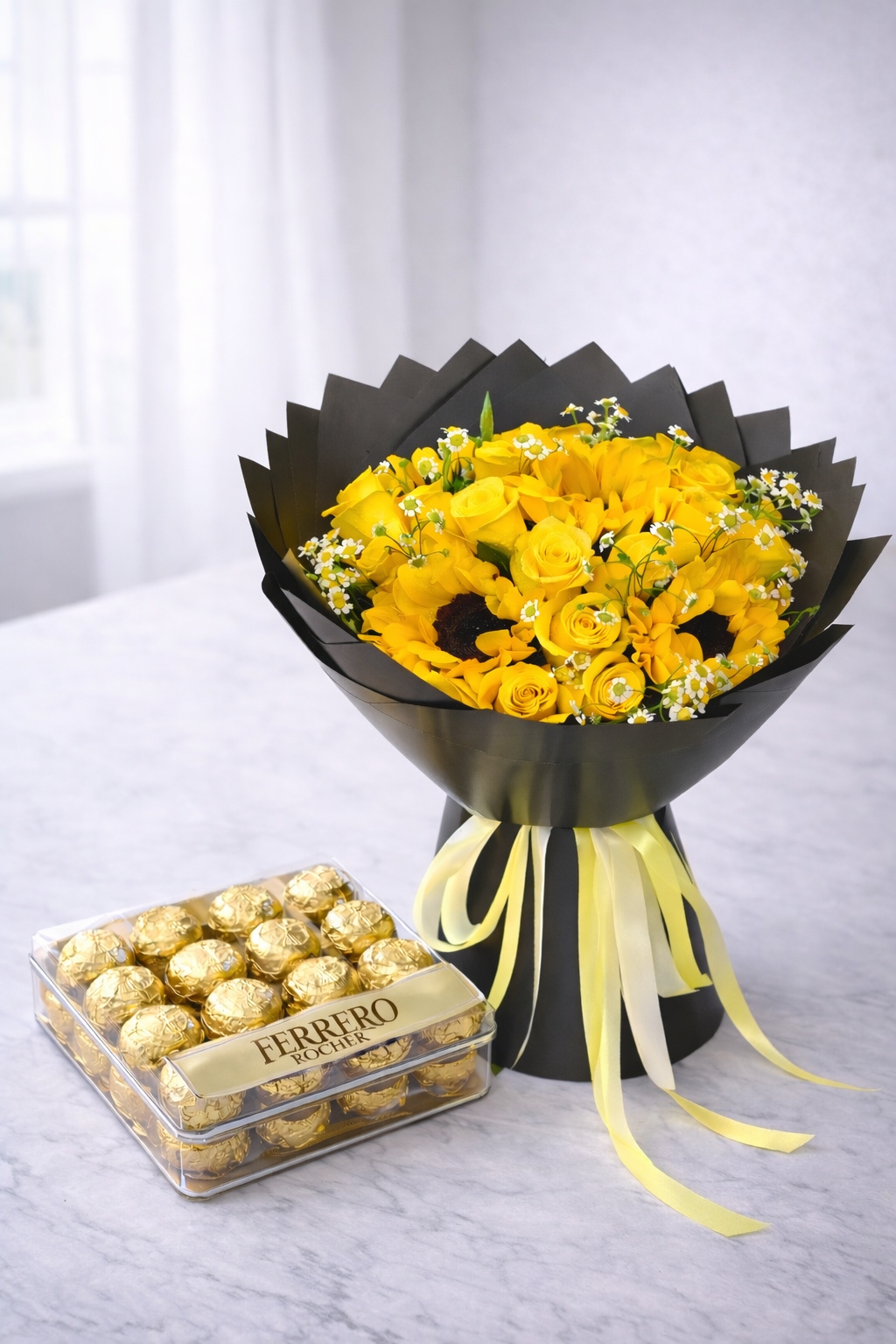 A radiant arrangement of 10 bright yellow roses blooms paired with luxurious Ferrero Rocher chocolates, and 3 sun flowers beautifully wrapped in sleek black paper. A perfect balance of sunshine, elegance, and indulgence in one unforgettable gift.