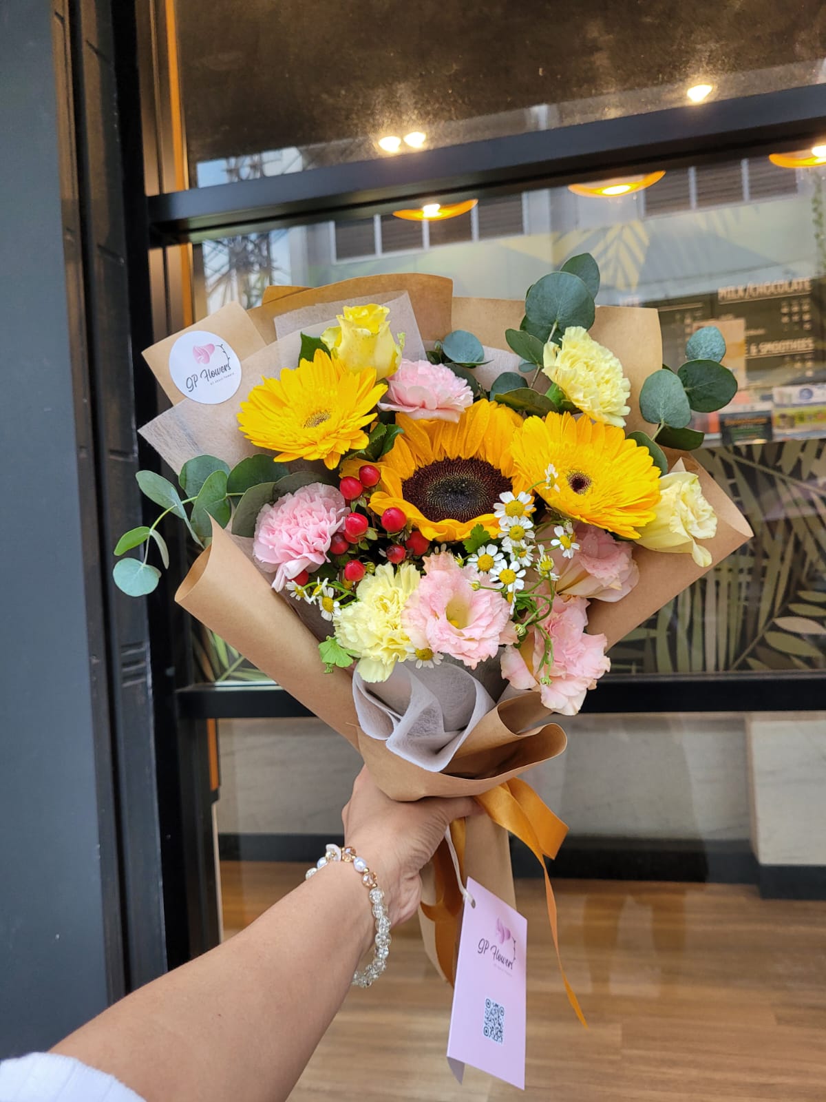 A bright, cheerful bouquet of sunflowers, roses, carnations, and eucalyptus—pure happiness wrapped in elegance! 🌻✨