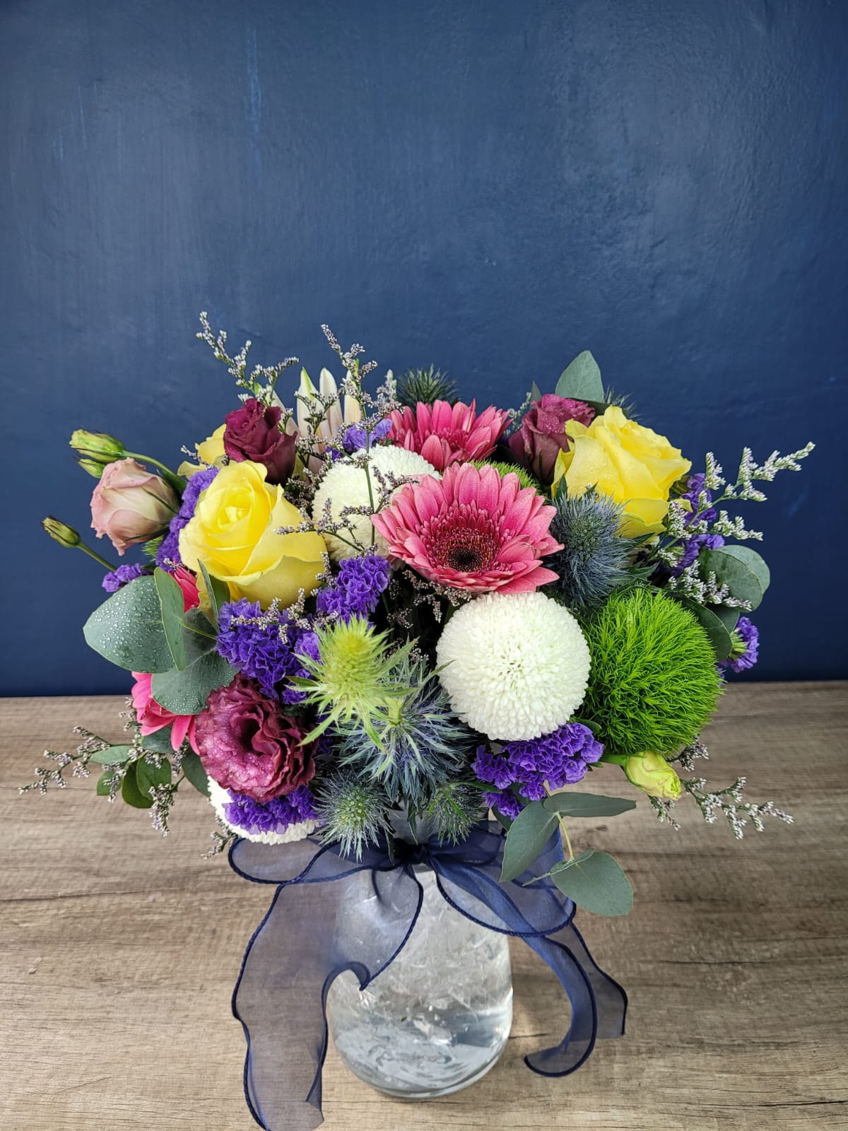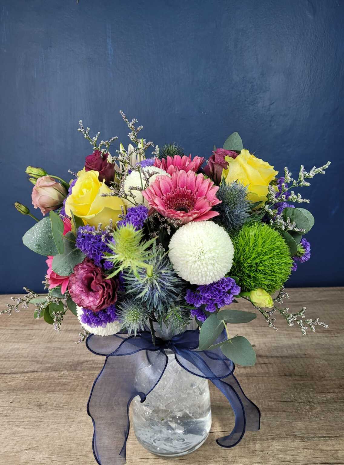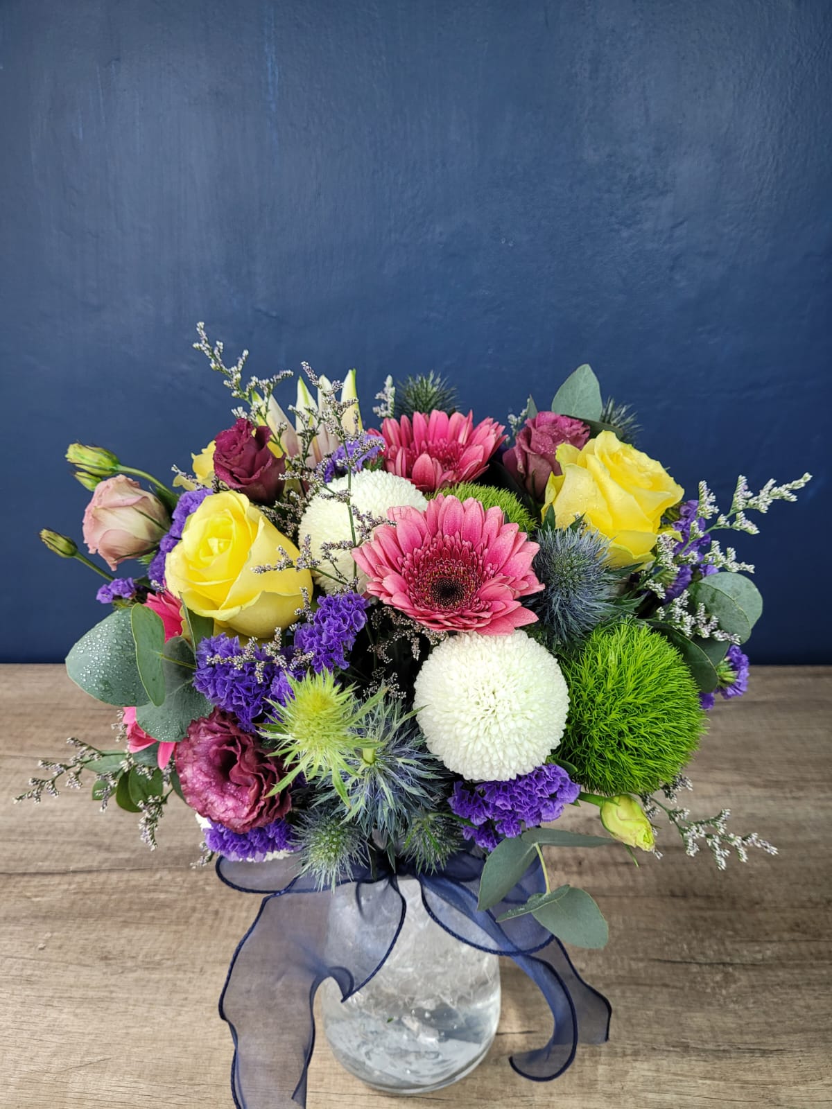 A vibrant mix of yellow roses, pink gerberas, white chrysanthemums, and lush greenery in a clear vase tied with a navy ribbon. Perfect for any occasion!