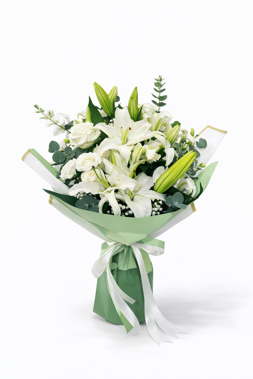 A graceful bouquet of fresh white lilies accented with soft greens and delicate fillers, wrapped in calming pastel tones. Designed to express purity, peace, and timeless elegance