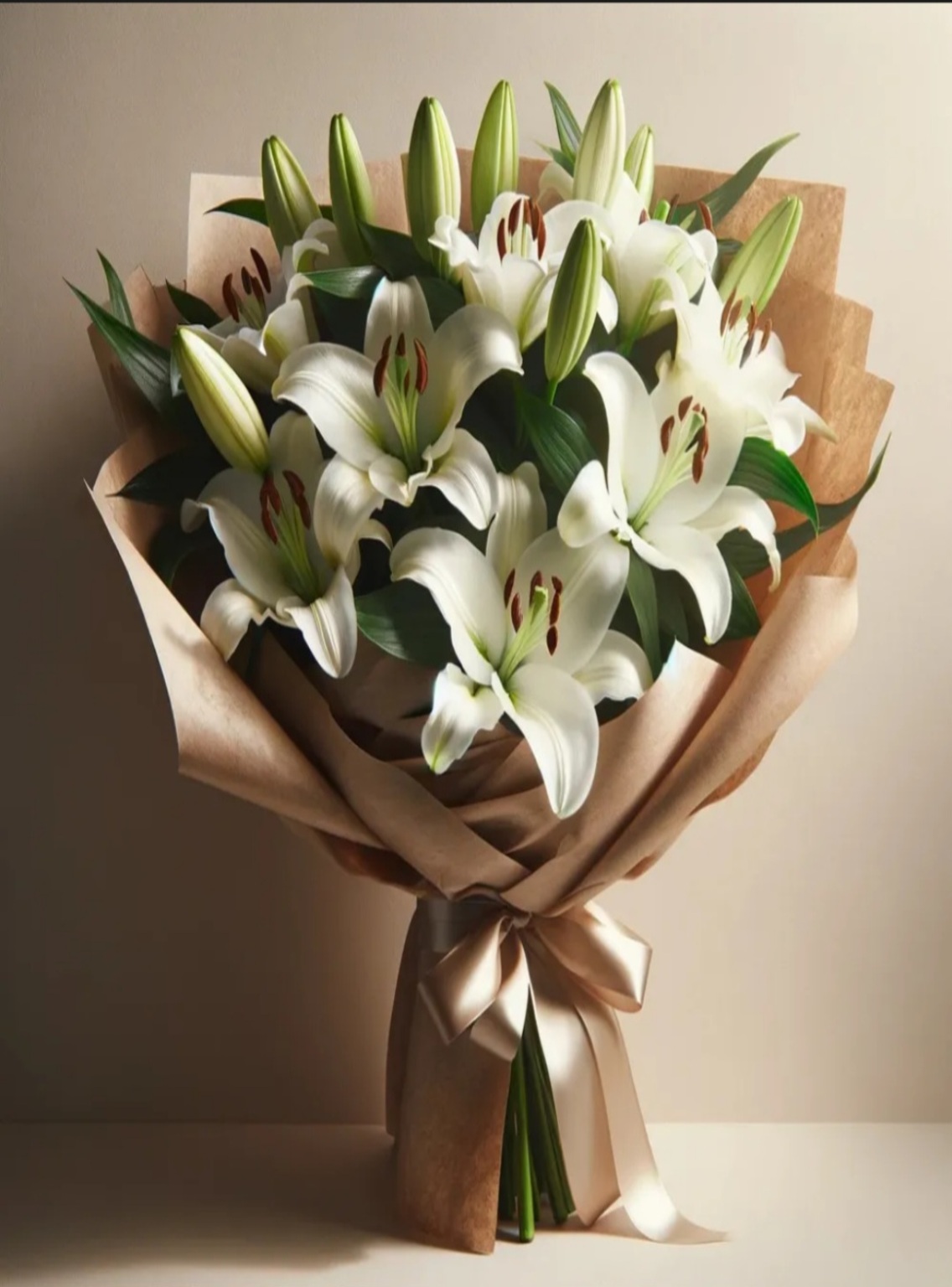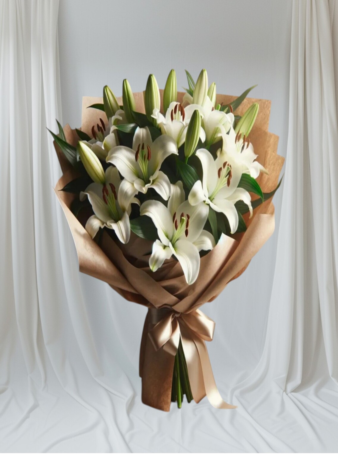 This is a beautiful bouquet of fresh white lilies, elegantly wrapped in brown paper with a satin ribbon. The white petals contrast beautifully with the green leaves and brown wrapping, making it a perfect gift for any special occasion.