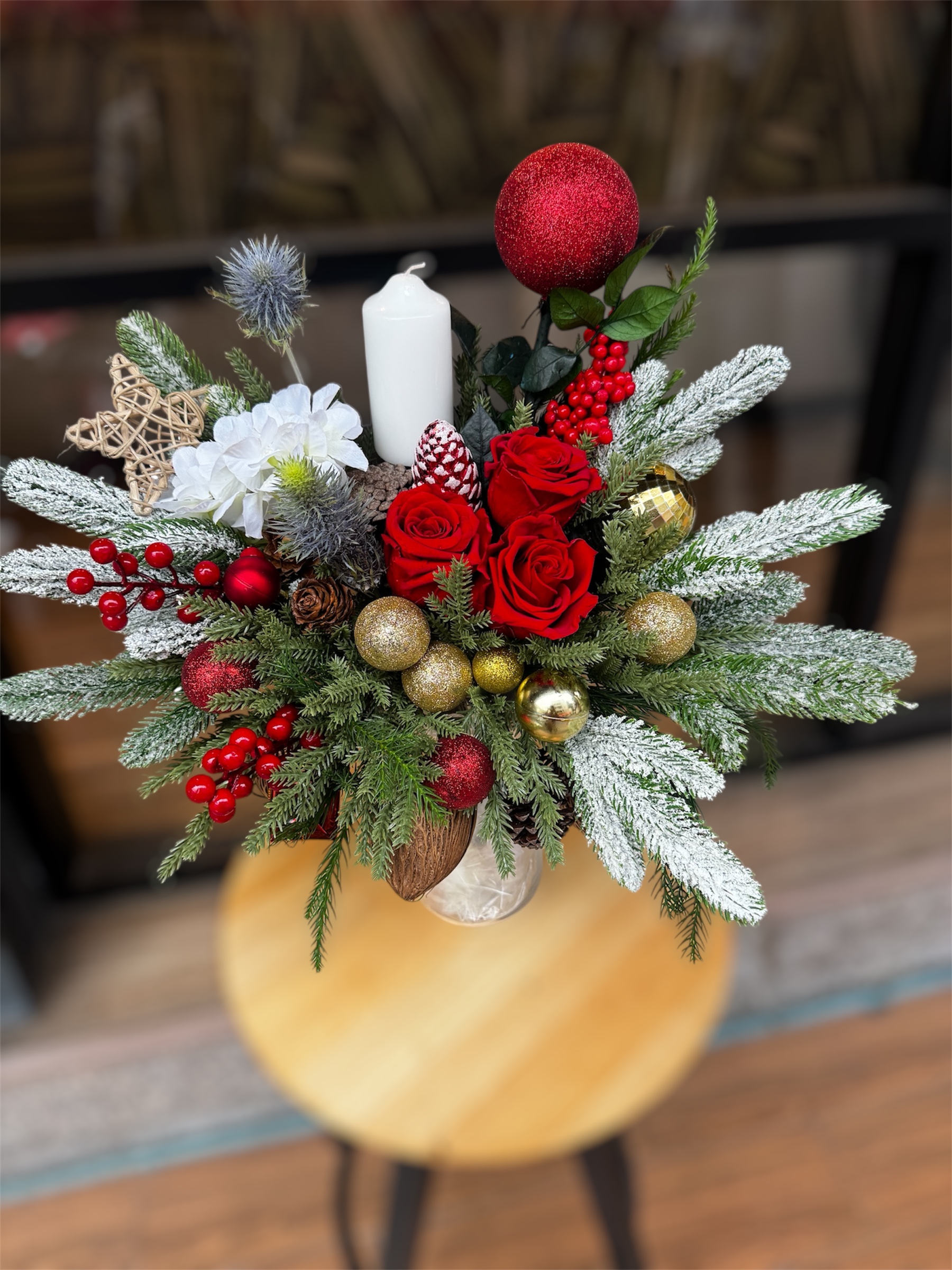 A festive Christmas arrangement featuring preserved red roses, winter greens, ornaments, and a candle. Long-lasting, elegant, and perfect for holiday décor or gifting.