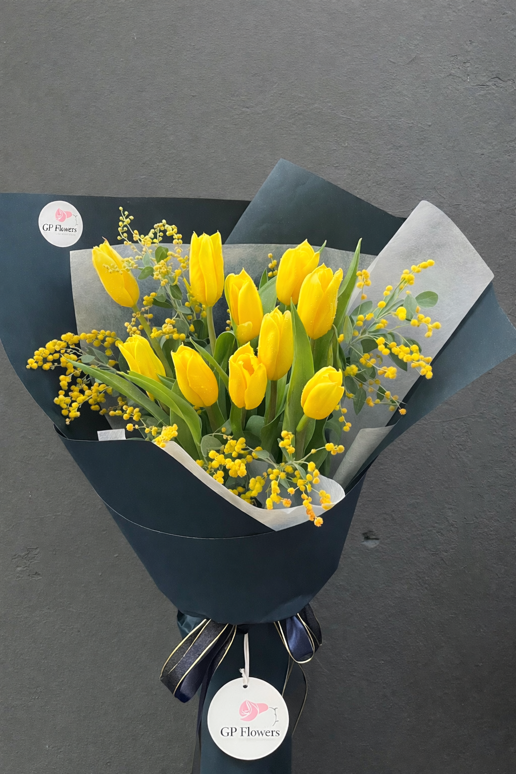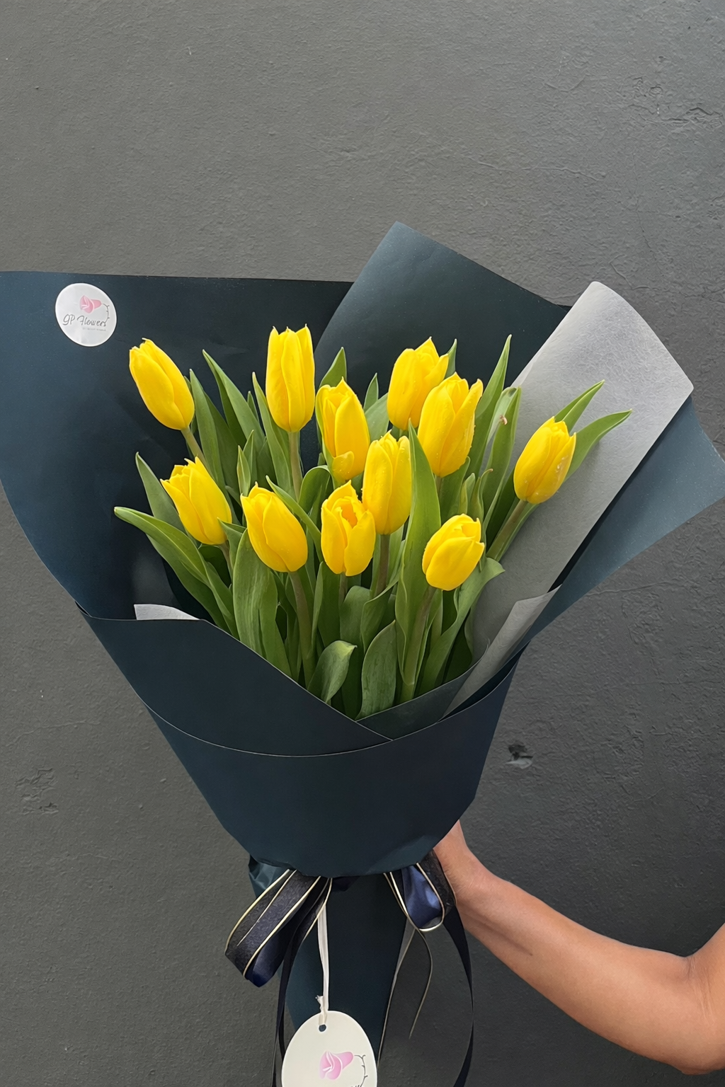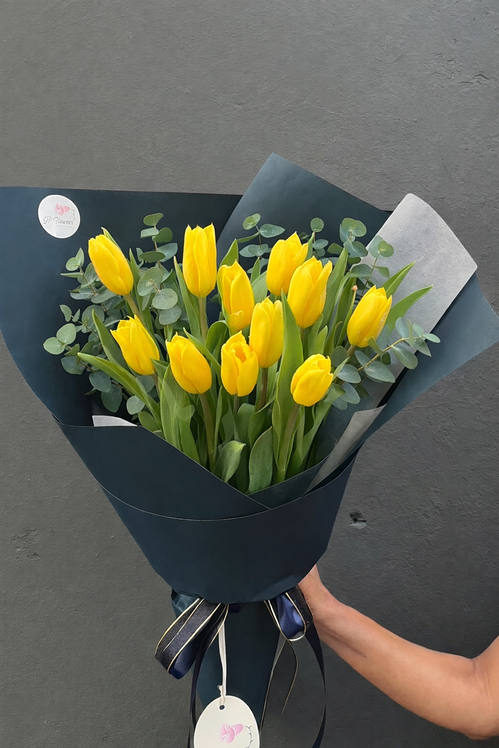 A cheerful bouquet of fresh yellow tulips, accented with soft eucalyptus and delicate seasonal fillers, wrapped in modern dark-toned paper. This arrangement radiates happiness and positivity, making it a perfect gift to brighten any day.